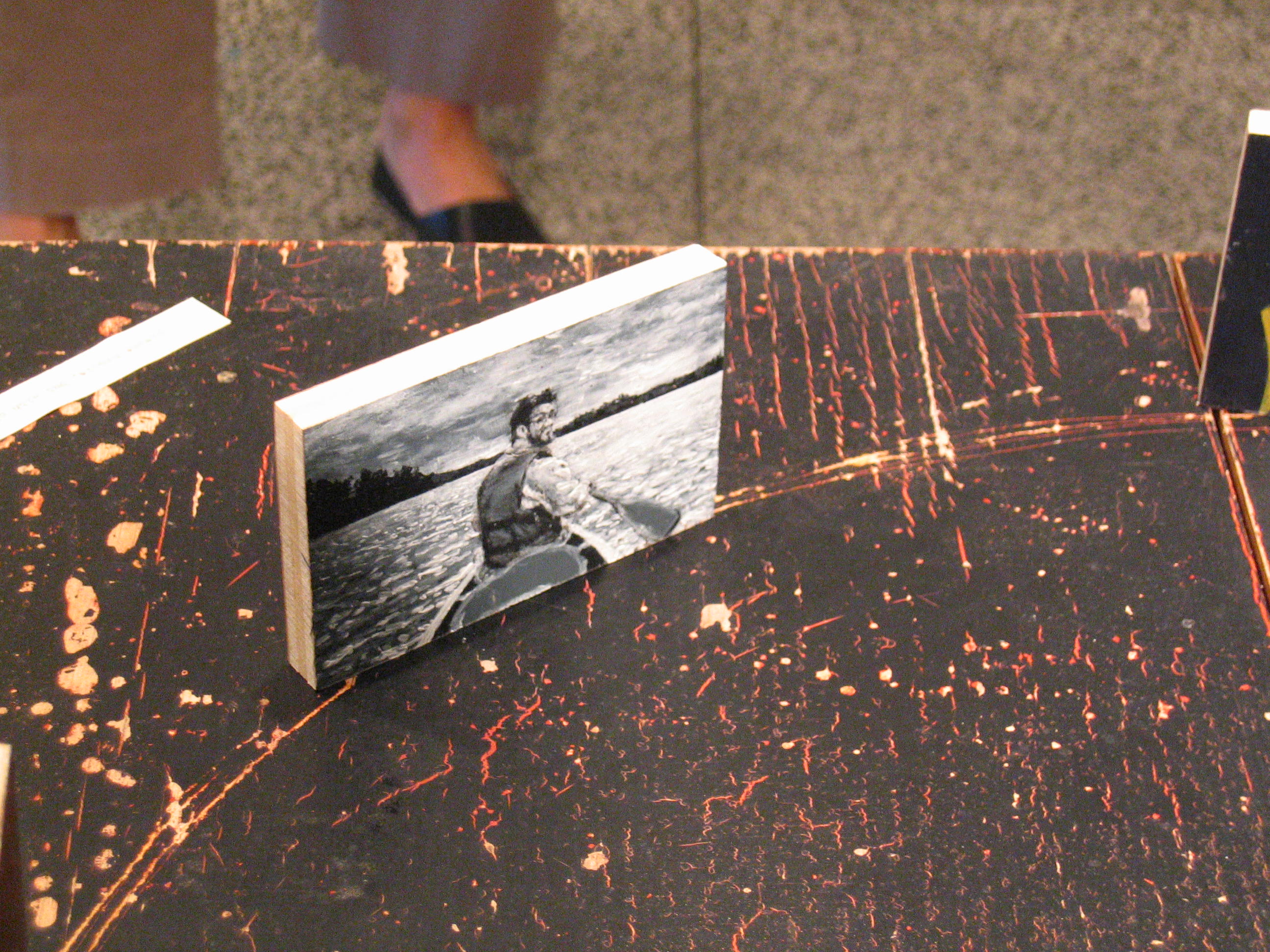Exhibition Shot 3 Acrylic on Wood Attached with string and weights through antique table Like Loading...