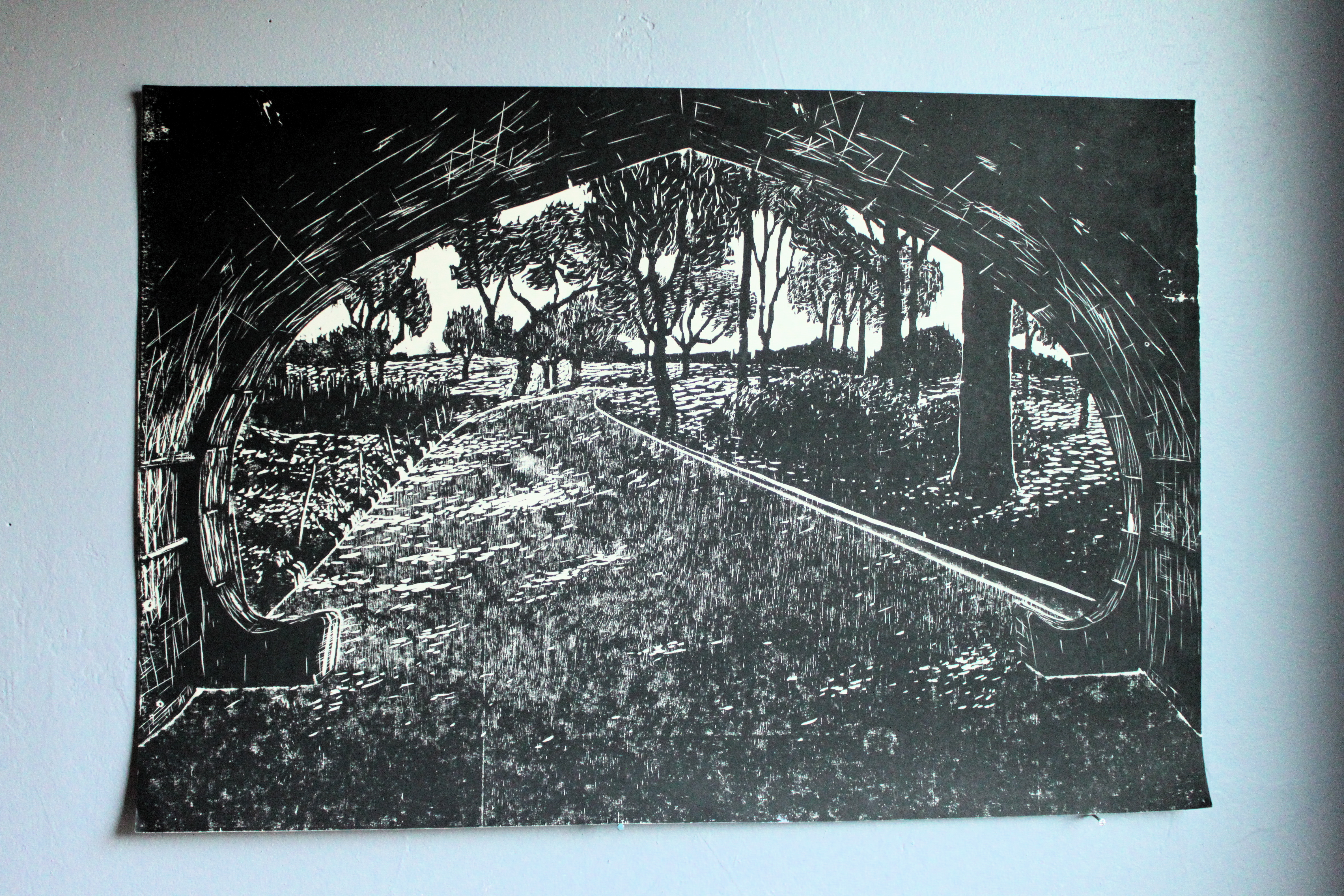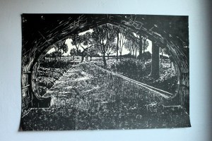 This piece was created using three blocks. The path and background trees are interlocking pieces, interchangeable with other blocks to create alternate backgrounds and foregrounds. The arch is another block, masked out and printed separately.